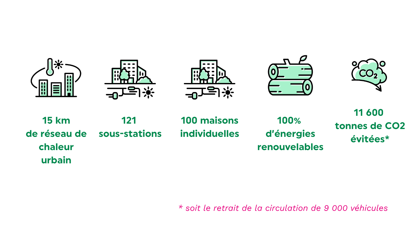 Courant 2025, le réseau de chaleur urbain fournira le chauffage et l'eau sanitaire aux abonnés. Il est alimenté à 90 % par du bois-énergie issus à 50 % de plaquettes forestières prélevées dans des forêts locales situées à moins de 100 km et 50 % de plaquettes situées à moins de 30 km. Le biométhane sera la seconde énergie renouvelable à hauteur de 10 %.