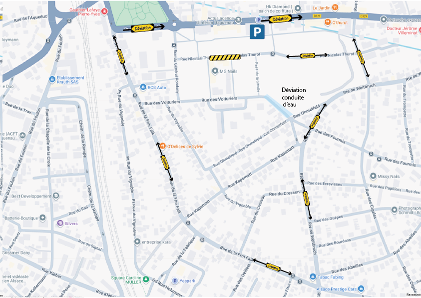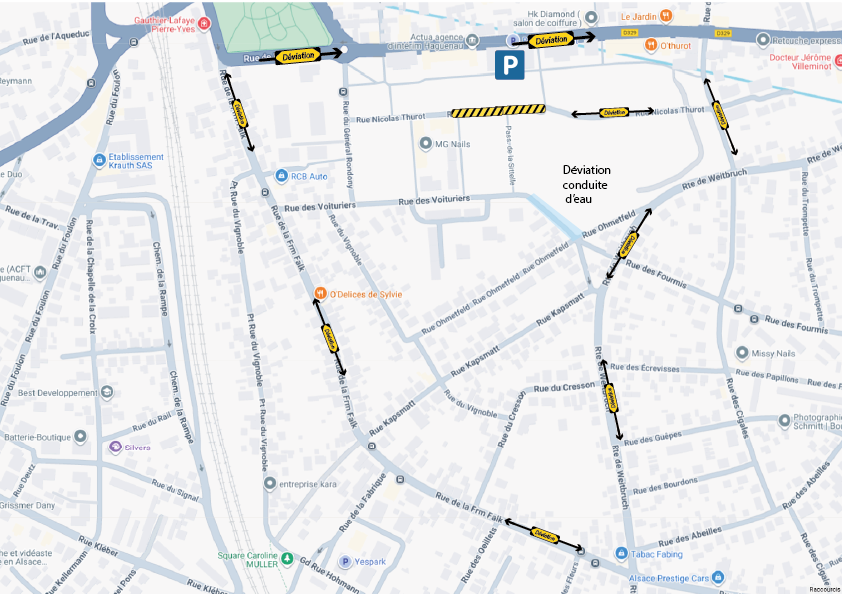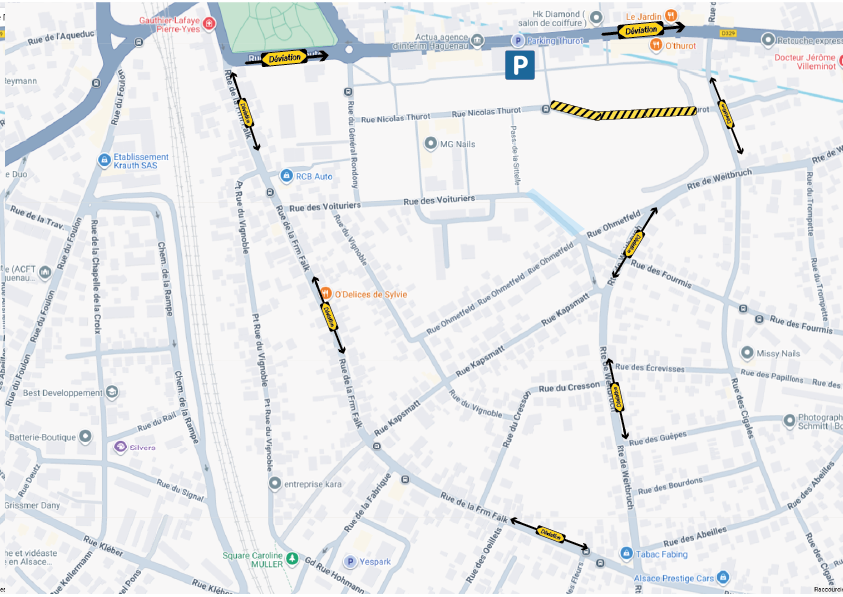 Des déviations sont mises en place aux abords des zones de travaux afin de contourner la rue barrée.